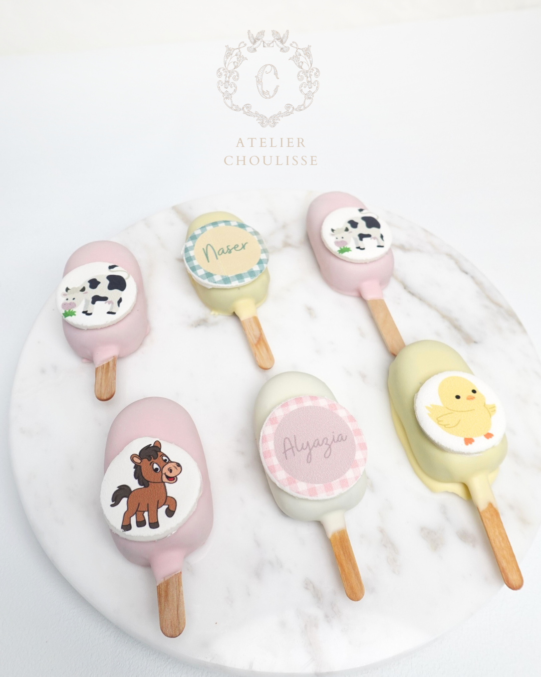 Our Farm-Themed Cakesicles bring a delightful touch of countryside magic to your celebration. Each cakesicle is handcrafted with precision, featuring playful farm-inspired details—think gentle pastels, miniature barn elements, and adorable animal accents designed with our signature refined aesthetic.