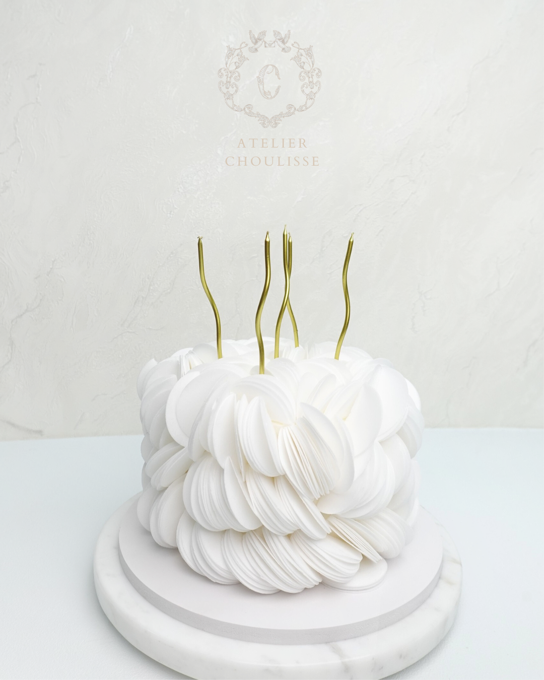 Custom-made at Atelier Choulisse, our white ruffle cake is a testament to timeless design, where beauty, craftsmanship and understated glamour meet.